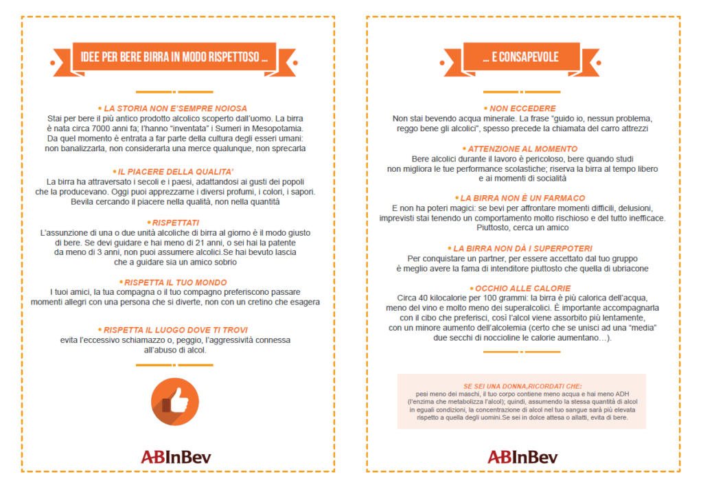 Molto dell’impegno CSR di AB InBev è indirizzato a promuovere con azioni concrete sulle comunità il consumo responsabile di birra, rafforzando la consapevolezza dei danni associati a un consumo eccessivo di alcol.
