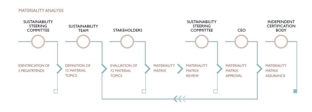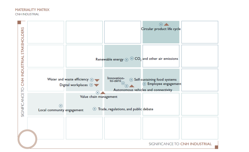 L’analisi di materialità per CNH Industrial è uno strumento che assicura l’allineamento tra le decisioni di business e gli aspetti che l’Azienda e gli stakeholder ritengono più significativi, in modo da permettere a CNH Industrial di rispondere alle sfide globali. Grazie a questo strumento CNH Industrial riesce a identificare quelli che sono gli aspetti materiali per l’Azienda e per i propri stakeholder, definendo di conseguenza nel Piano di Sostenibilità i target di miglioramento nel medio e lungo periodo, basati sui potenziali rischi e opportunità legati alle attività aziendali. Il processo che guida l’analisi di materialità in CNH Industrial è partito dall’osservazione dei megatrend, intesi come fenomeni esterni in grado di influenzare le scelte di business attuali e future dell’Azienda, da cui sono stati successivamente selezionati dal top management i tre megatrend più significativi per CNH Industrial. I cambiamenti climatici, la scarsità e la sicurezza del cibo e il mondo digitale sono stati identificati come i fenomeni che possono impattare maggiormente sui business di CNH Industrial. Gli aspetti materiali che costituiscono la matrice di materialità sono stati individuati come le risposte di CNH Industrial a questi megatrend, ovvero come attività che possono mitigarne l’impatto o sfruttare gli aspetti positivi (quest’ultimo è il caso del mondo digitale). I 12 aspetti materiali vengono annualmente valutati per importanza da un numero crescente di stakeholder (negli ultimi due anni 1.321 persone, tra esterni e interni, sono stati interpellati). Sulla base della rilevanza attribuita agli aspetti materiali dagli stakeholder, viene redatta la matrice di materialità. La matrice è revisionata e approvata dal top management aziendale (Sustainability Steering Committee) e dal CEO.