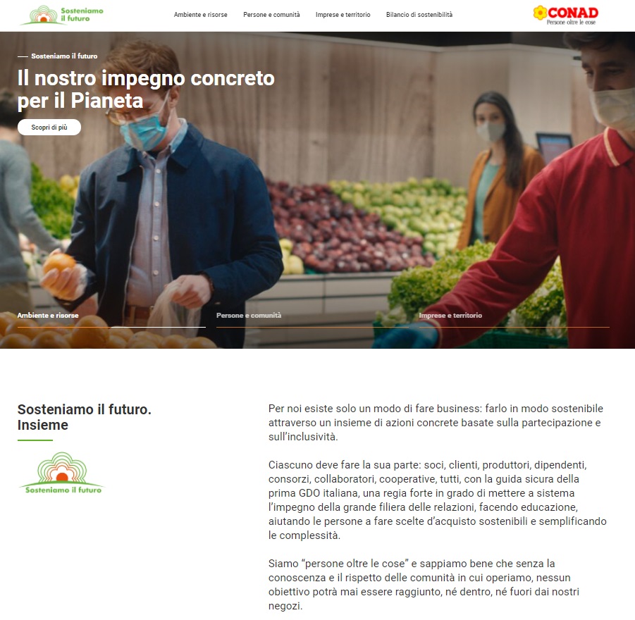 Per Conad esiste solo un modo di fare business: farlo in modo sostenibile attraverso un insieme di azioni concrete basate sulla partecipazione e sull’inclusività.Ciascuno deve fare la sua parte: soci, clienti, produttori, dipendenti, consorzi, collaboratori, cooperative, tutti, con la guida sicura della prima GDO italiana, una regia forte in grado di mettere a sistema l’impegno della grande filiera delle relazioni, facendo educazione, aiutando le persone a fare scelte d’acquisto sostenibili e semplificando le complessità. Siamo “persone oltre le cose” e sappiamo bene che senza la conoscenza e il rispetto delle comunità in cui operiamo, nessun obiettivo potrà mai essere raggiunto, né dentro, né fuori dai nostri negozi. È questo il senso più autentico dell’espressione “una comunità è più grande di un supermercato”: la sostenibilità parte dal singolo e si diffonde nel contesto circostante, contaminando le buone abitudini che noi di Conad abbiamo cominciato ad attuare già da tempo.