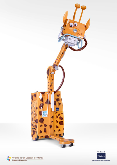 Tra gli interventi merita citare la sala TAC dell’Ospedale infantile Regina Margherita della Città della Salute di Torino, trasformata in un accogliente bosco colorato, quella dell’Ospedale Gaslini di Genova, realizzando in collaborazione con Walt Disney un mondo fantastico con i personaggi Pixar di Toy Story, il progetto “Dottoressa Giraffa”, un macchinario radiologico portatile personalizzato per raffigurare una giraffa amica e, per ultimo, il “Doctor Topo LINO”, uno strumento portatile personalizzato con l’aspetto di un simpatico topolino.