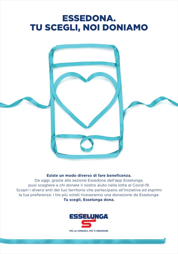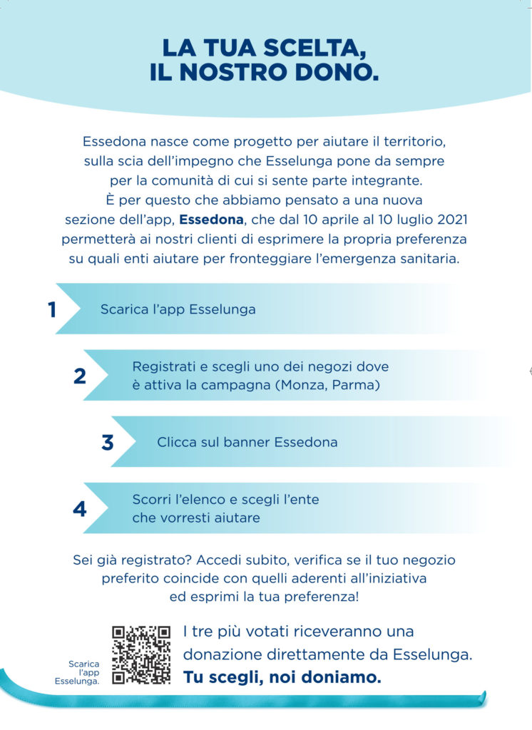 La solidarietà e la tecnologia unite per sostenere il Terzo Settore. Un esempio viene dalla campagna ESSEDONA, promossa da Esselunga in collaborazione con Donapp. Fino al 6 aprile, gli Enti del Terzo Settore di Parma e Monza hanno potuto iscriversi a ESSEDONA e presentare una propria iniziativa solidale ideata per fronteggiare l’emergenza COVID-19, supportando le persone in difficoltà e le comunità duramente colpite dalla pandemia. Dal 10 aprile al 10 luglio, i clienti dei negozi Esselunga di Parma e Monza, tramite la App Esselunga, potranno conoscere i progetti ammessi alla campagna ed esprimere la propria scelta. In seguito, Esselunga donerà un monte donazioni ai tre enti più votati dai clienti, dando forza a un’iniziativa di Corporate Social Responsibility attenta all’ascolto e al coinvolgimento delle persone dei territori e, soprattutto, capace di restituire valore e impatto sociale alle comunità.