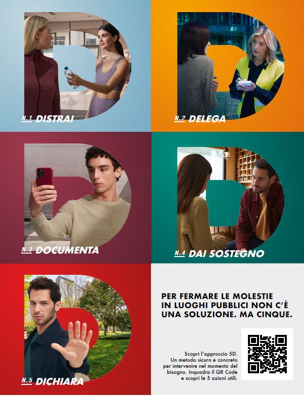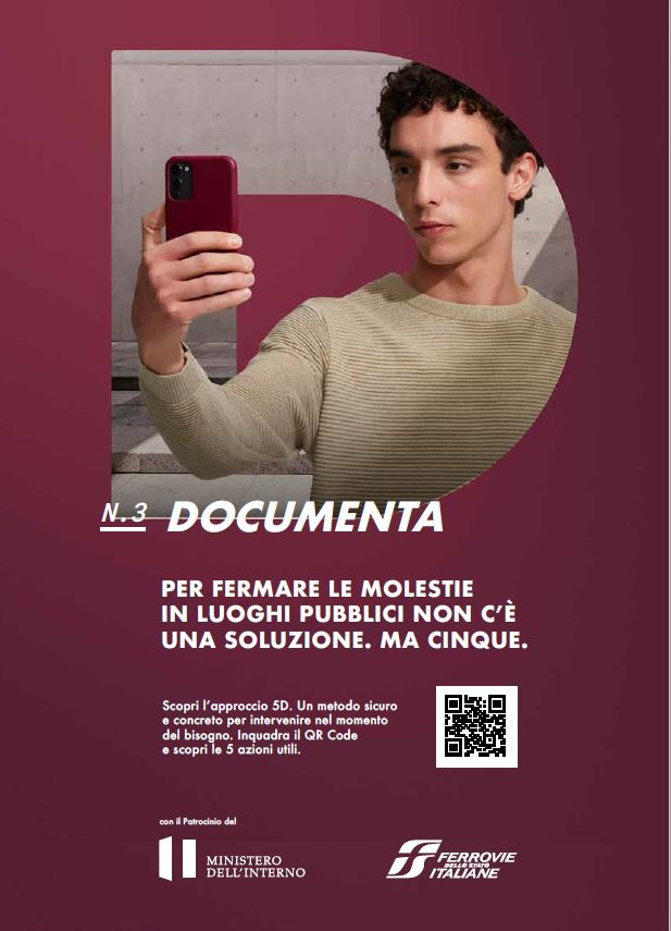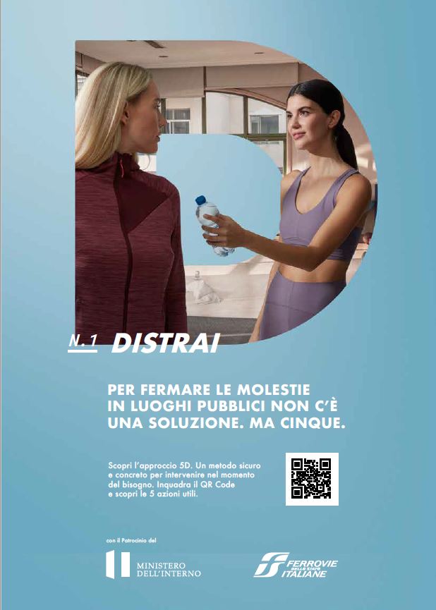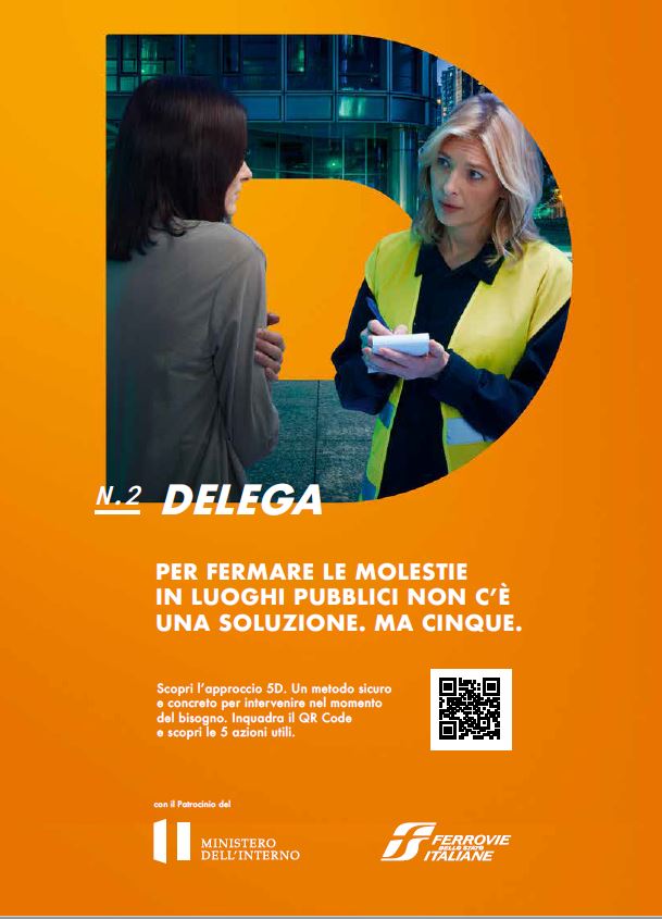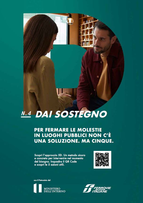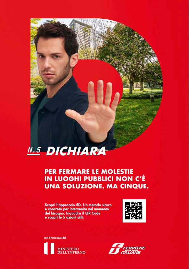 Ferrovie dello Stato Italiane ha diffuso in tutta Italia le 5D, un metodo di intervento testato e sicuro contro le molestie in luoghi pubblici, sviluppato dall’associazione Right To Be, una ONG americana con focus sulla lotta alle molestie. La campagna conduce tramite QR code ad una landing page dove assistere gratuitamente ad un video training di dieci minuti circa sull’uso della metodologia. La campagna è stata diffusa su tutti gli asset FS e non solo: la creatività è stata on air per un mese sui videowall delle 10 più grandi stazioni italiane e in più di 100 stazioni su tutto il territorio nazionale, in più di 30 stazioni di servizio Anas, nelle fermate e sui bus di Busitalia, sui Regionali e AV Trenitalia, su Bus e Treni FSE, nelle biglietterie, erogatori automatici e sale Lounge, su un treno AV con Livrea con grafica 5D, nei Videowall di importanti piazze di Milano, Roma e Torino, nel Portale Frecce e sul magazine La Freccia, sulle Pagine Social del Gruppo FS e con Repost social degli account societari e su alcune testate esterne. L’obiettivo della campagna è abilitare le persone alla metodologia delle 5D, cinque soluzioni da adottare se si assiste ad una molestia in luogo pubblico, per mettere chiunque nelle condizioni di poter intervenire in sicurezza. Il target di riferimento della campagna abilitante sono tutte le persone (indipendentemente da genere, età, etnia ecc.), proprio perché è il contributo di tutti ad essere fondamentale per arginare un fenomeno così diffuso e difficile da affrontare.