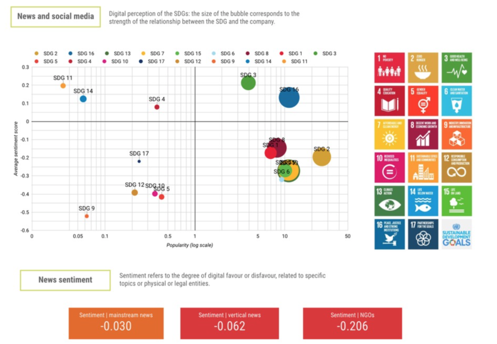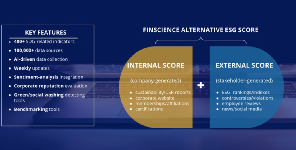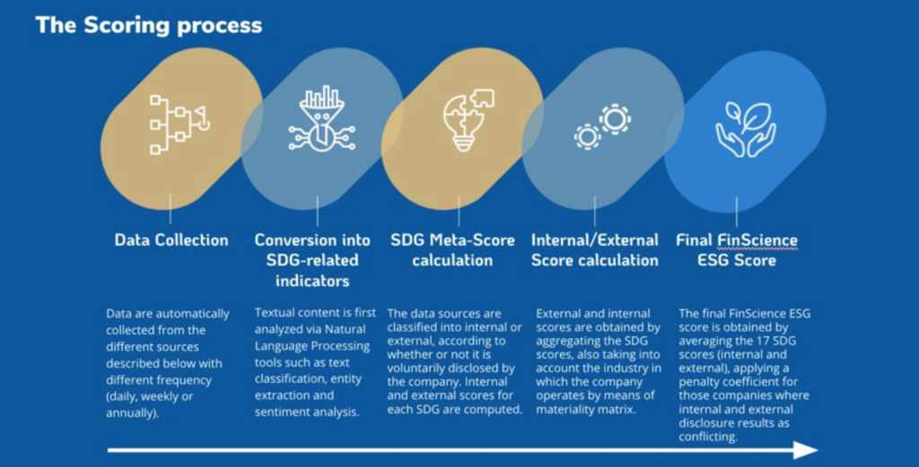 Pertanto la soluzione proprietaria sviluppata da FinScience integra tramite Intelligenza Artificiale i cosiddetti dati interni dell’azienda con una grande quantità di dati alternativi esterni digitali generati dagli stakeholder, così da fornire la possibilità di monitoraggio completo degli effettivi risultati ESG raggiunti in relazione ai singoli 17 SDG delle Nazioni Unite e nel complesso – anche rispetto ai concorrenti – sia alle aziende stesse, sia ai possibili investitori. In caso di divario tra interno ed esterno, attraverso la soluzione FinScience, le aziende sanno esattamente dove intervenire e secondo quale priorità.