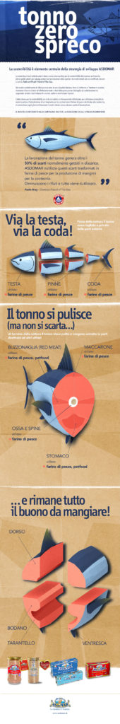 Il progetto Tonno Zero Spreco riflette l’approccio dell’azienda alla sostenibilità nella gestione dell’intero processo produttivo. L’industria del tonno genera normalmente circa il 50% di scarti, Generale Conserve utilizza e valorizza tutte le parti della materia prima senza sprechi. Abbiamo attivato un impianto di farine di pesce, per utilizzare anche le “ultime” parti del tonno nella produzione di farine di pesce per la zootecnia, senza dimenticare la produzione di petfood (specialità umido gatto). Anche del tonno non si butta via niente!