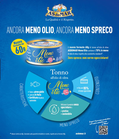 Negli ultimi 2 anni, il rincaro dell’olio di oliva, ha giocato un ruolo importante all’interno del mercato del tonno sott’olio. I consumatori hanno visto ridursi il potere d’acquisto, a causa di un aumento dei prezzi a scaffale a due cifre che ha modificato in modo piuttosto profondo il carrello della spesa. Da questo punto di partenza abbiamo lavorato con l’intento di contenere gli aumenti di costo di quello che per noi è soprattutto un liquido di governo, e che nella maggioranza dei casi viene eliminato prima del consumo, nell’ottica di perseguire una politica sostenibile e antispreco, in linea con i nostri valori aziendali. Abbiamo così deciso di implementare una tecnologia che ci consentisse di ridurre una quota parte dell’olio, mantenendo inalterato il quantitativo di tonno. Senza variare la qualità e la resa organolettica, ci proponiamo in questo modo di tutelare il posizionamento di prezzo della nostra offerta, e al contempo offrire un prodotto sempre più salubre ed eco-sostenibile. Con tonno all’olio di oliva MENO OLIO nel nuovo formato 60g abbiamo ridotto di oltre il 70% il quantitativo di olio in ogni lattina, rispetto ad una lattina classica da 80g. Diffusamente considerato, in Italia, solo liquido di copertura e abitualmente non utilizzato dai consumatori, con il tonno MENO OLIO 60g abbiamo raggiunto l’obiettivo di offrire un prodotto di qualità con un notevole risparmio di olio, sia in fase produttiva sia di consumo. Una risorsa preziosa, che per un biennio è stata scarsa e costosa; durante il consumo delle conserve ittiche non viene valorizzata come dovrebbe ma contribuisce prevalentemente alla dispersione nell’ambiente di olio esausto per uso alimentare. Il tonno all’olio di oliva ASDOMAR “Meno Olio” nel formato 60 grammi contiene lo stesso quantitativo di tonno (52g) di una scatoletta standard da 80g, ma ancora meno olio, per un prodotto ancora più pratico, più salubre e senza dubbio fortemente connotato da una missione antispreco.