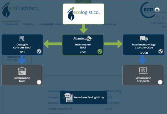 • Ecologistico2, il tool di simulazione per calcolare le emissioni (CO2e e PMx) in ambito trasporti e magazzini e per identificare le azioni più efficaci per ridurle.