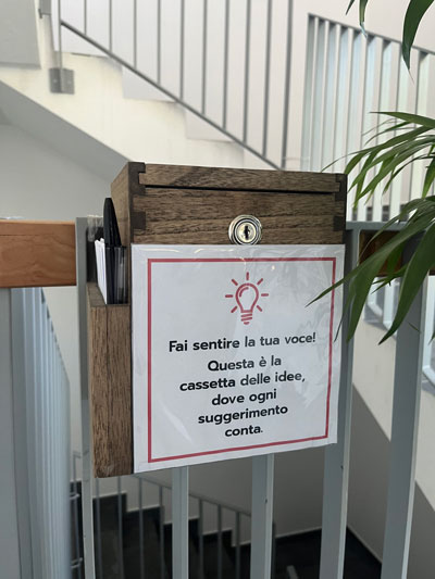 4) SUGGESTION BOX: è stata posizionata in ufficio una cassetta in cui chiunque può fare proposte anonime su come migliorare il benessere in azienda. Ogni proposta viene presa in considerazione dall’HR per arricchire, di anno in anno, il piano sostenibilità.