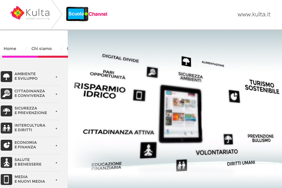 Kulta negli anni ha acquisito un’expertise unica sul mercato italiano, mettendo in relazione il mondo delle aziende e degli enti socialmente responsabili con il mondo della scuola, degli insegnanti, degli studenti e delle famiglie, con progetti in grado di attivare gli stakeholder principali coinvolti in progetti di Corporate Social Responsibility. Tutto questo grazie a un Team in grado di realizzare contenuti adatti ai nuovi media, ai linguaggi dei giovani e alle metodologie della scuola. E grazie a un mix tra competenze di comunicazione tradizionali (comunicazione istituzionale di brand, valoriale, di social responsibility delle aziende), padronanza dei canali e dei linguaggi digitali adatti alla scuola 2.0 e conoscenza del mondo scolastico, dell’edutainment e dell’universo dei bambini e dei ragazzi. Il Team Kulta, che ha al proprio attivo molte delle principali case history italiane su progetti di CSR e di edutainment rivolti a studenti e insegnanti, ha ideato e sviluppato la piattaforma proprietaria Scuola Channel, concepita per proporre alle scuole contenuti educativi digitali gratuiti su temi di rilevanza didattica, sociale e culturale. Grazie a Scuola Channel è possibile: comunicare in modo proattivo e professionale con il mondo della scuola e dei suoi attori (insegnanti, studenti, famiglie, enti, istituzioni) mettere al servizio dei progetti creatività, produzione di contenuti originali, ottimizzazione dei materiali esistenti, valorizzazione del contributo di tutti i soggetti partecipanti fornire consulenza alle Aziende e agli Enti che intendono promuovere progetti educativi e risorse utili alla crescita delle nuove generazioni, garantendo un’esperienza unica in Italia. www.scuolachannel.it