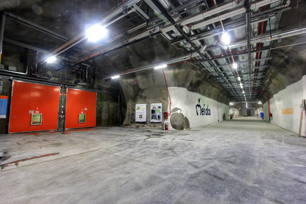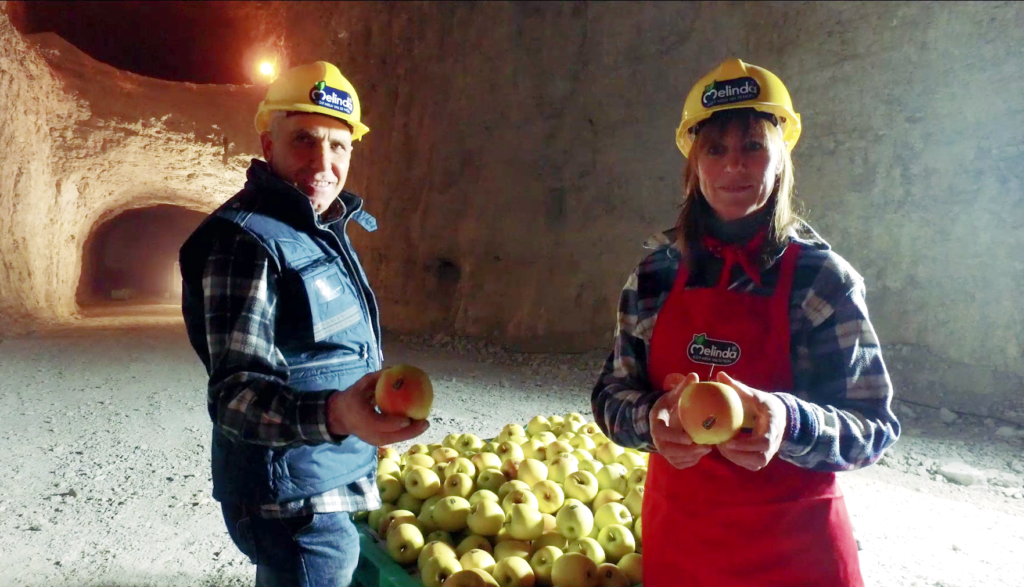 Non c’è luogo in cui le nostre mele stiano meglio se non come al di sotto delle radici degli alberi da cui sono nate, su cui sono cresciute e diventate Melinda. La stessa sottile energia che ha nutrito i meli ora protegge i frutti. Grazie a una felice intuizione, da qualche anno le mele della Val di Non vengono tenute nell’atmosfera fresca e costante di immense gallerie scavate nella roccia Dolomia della Miniera di Rio Maggiore, ottimizzando così le cavità rimaste inutilizzate dall’attività estrattiva della roccia da parte di Tassullo, l’azienda produttrice di materiali edili concessionaria della miniera. Un posto non molto diverso dalla cantina dove i nostri nonni conservavano le mele, stendendole una per una sulla paglia, al buio e a una temperatura pressoché costante in tutte le stagioni. Le Celle Ipogee si trovano a circa 575 m.s.l.m, e a 275 m sotto la superficie della terra in cui sono stati piantati i nostri primi meleti. Qui abbiamo realizzato il primo e unico impianto al mondo per la frigo-conservazione di frutta in ambiente ipogeo e in condizioni di atmosfera controllata, ovvero un frigorifero naturale che rispetta l’ambiente e mantiene intatta la qualità delle mele Melinda. Ciò vuol dire una notevole riduzione dell’impronta ambientale complessiva dell’opera già esistente, oltre alla diminuzione dell’impegno economico, rispetto a quello medio, per la realizzazione di un equivalente impianto in epigeo, cioè in superficie. Questo rivoluzionario metodo di conservazione oggi contribuisce in maniera determinante alla salvaguardia del nostro territorio, grazie alla riduzione del consumo di energia (che significa diminuzione dell’immissione di CO2 nell’atmosfera), al forte risparmio idrico, conseguente alla possibilità di usare la geotermia per il raffreddamento dei compressori; all’eliminazione dei pannelli coibentanti in poliuretano espanso, il cui smaltimento genera forte inquinamento; alla tutela del paesaggio e del territorio agricolo, evitando di edificare un nuovo grande capannone in superficie e infine all’ottimizzazione di una cavità mineraria esistente, altrimenti inutilizzata.