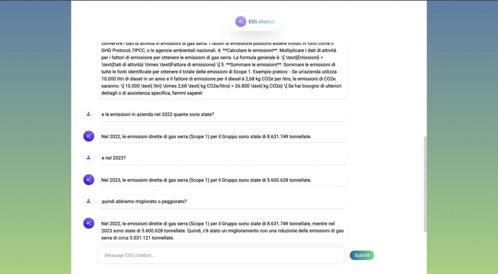 ESG Chatbot è un Chatbot addestrabile sulla base dei dati e delle informazioni aziendali che risponde in tempo reale e in modo naturale alle domande o alle richieste di informazioni sul posizionamento ESG dell’azienda. Consente di agevolare la diffusione interna delle informazioni di sostenibilità (ad es. per le strutture di IR), ma anche l’engagement verso l’esterno. Facilita l’accesso alle informazioni dei report di sostenibilità.