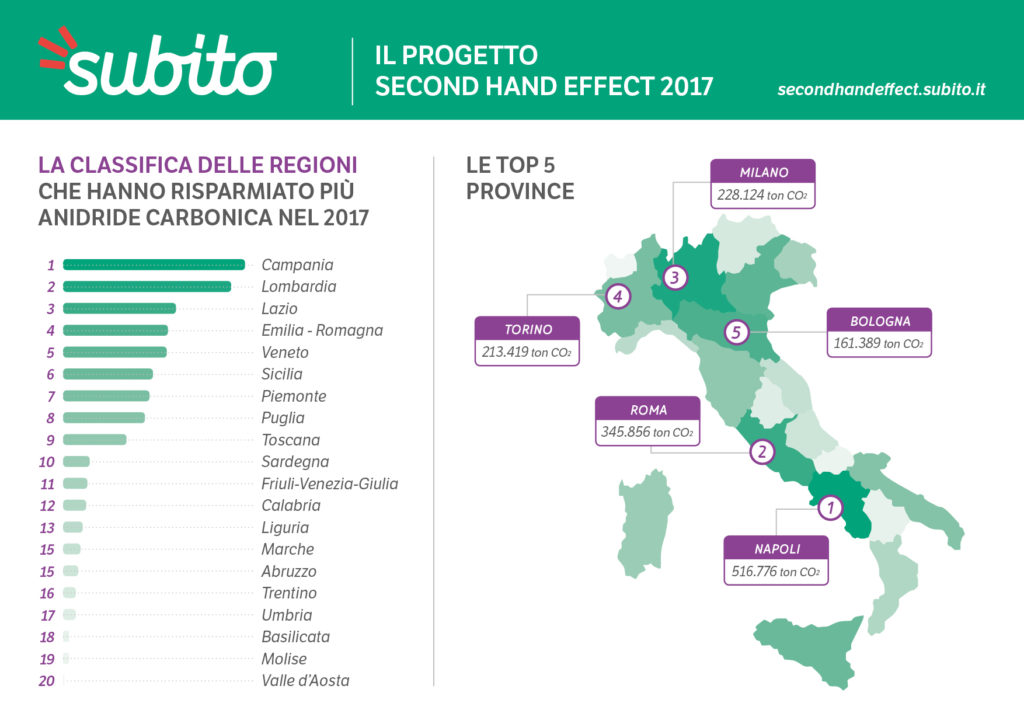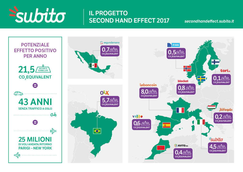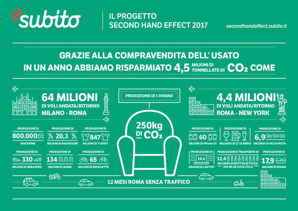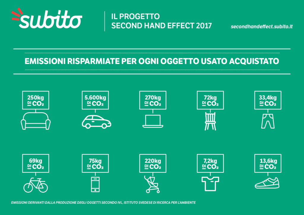 Le numerose possibilità offerte dal digitale hanno facilitato lo sviluppo di forme di economia sostenibile, come la Second Hand Economy, un modello economico che supera il paradigma lineare di produzione-distribuzione-consumo-dismissione per avviare un circolo virtuoso che dà valore al bene, che vive una seconda vita, evitando la produzione di un bene nuovo e la conseguente dismissione in discarica dell’usato. Una forma di economia circolare che, pur mantenendo l’attenzione sul prodotto, cambia l’approccio nei confronti del suo ciclo di vita. Secondo l’Osservatorio Second Hand Economy 2017, condotto da DOXA per Subito, l’economia dell’usato ha generato un valore di 21 miliardi di euro (+11% vs 2016) pari all’1,2% del PIL del Paese, di cui 9,3 miliardi di euro online (+72% vs 2014). La Second Hand Economy, inoltre, ha un effetto positivo sull’ambiente perché con la compravendita di usato si allunga la vita di un prodotto e conseguentemente si abbattono le emissioni di anidride carbonica e lo spreco di materiali derivanti dalla produzione di un nuovo bene o dalla sua dismissione in discarica. Secondo l’Istituto Svedese di Ricerca Ambientale (IVL), nel 2017 gli 8 milioni di utenti di Subito hanno risparmiato 4,5 milioni di tonnellate di CO2, una quantità equivalente a tutto il traffico di Roma per 12 mesi, e 246.000 tonnellate di plastica, paragonabili alla quantità necessaria a produrre 4,6 miliardi di bottiglie PET da 2 litri.