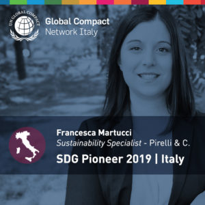 Abbiamo deciso di premiare ufficialmente Francesca Martucci nell’ambito del prossimo Italian Business & SDGs Annual Forum per valorizzare sia l’ottimo lavoro svolto dalla stessa all’interno di Pirelli & C., sia il concorso in sé che è parte della campagna globale “Making Global Goals Local Business” del Global Compact. L’SDG Forum riunisce ogni anno circa 130 rappresentanti del settore business e non business italiano, accomunati da una forte sensibilità e da un impegno quotidiano sui temi della sostenibilità.